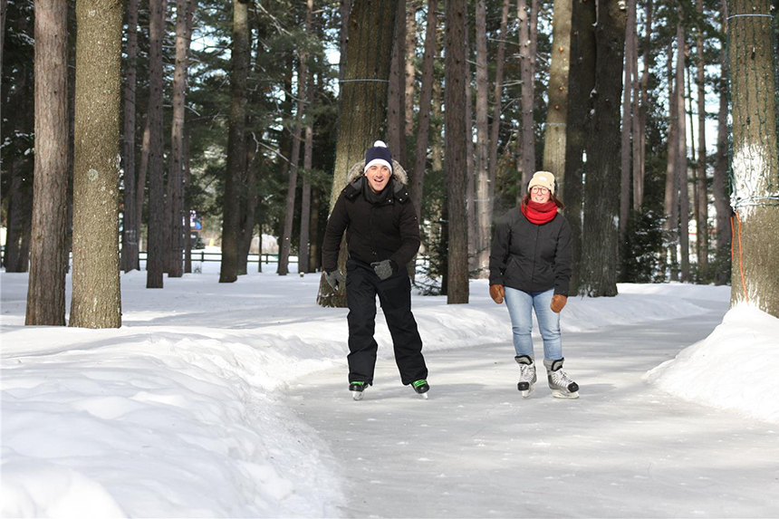 À Saint-Donat, un parcours d’un peu plus d’un kilomètre accueille les patineurs de tous les niveaux au cœur de la jolie forêt du parc des Pionniers.