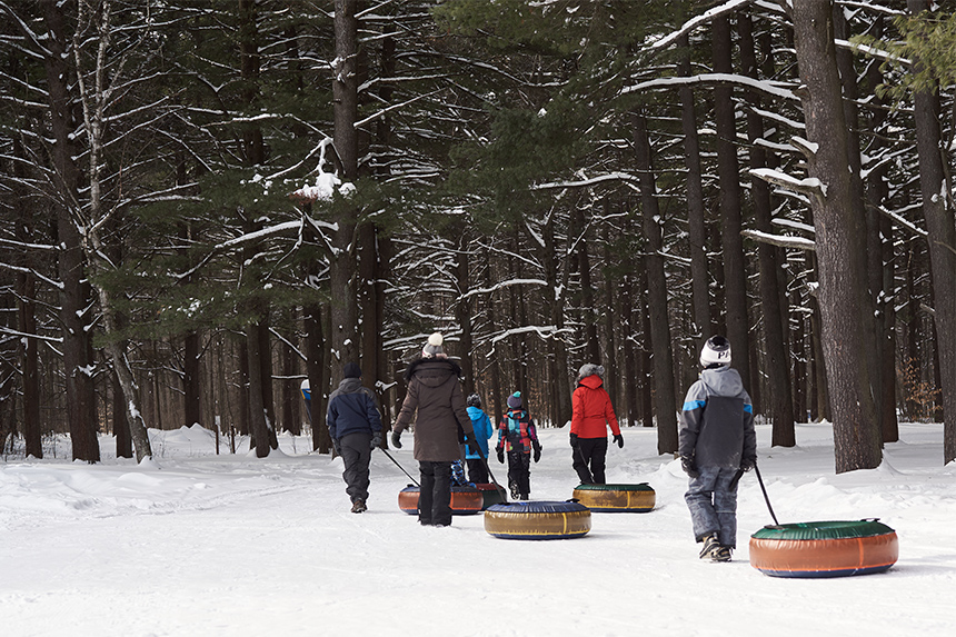 Ill est possible d’aller glisser sur des chambres à air sur le mont Royal, en plein cœur de la ville de Montréal. L’activité coûte 10 $ par personne.