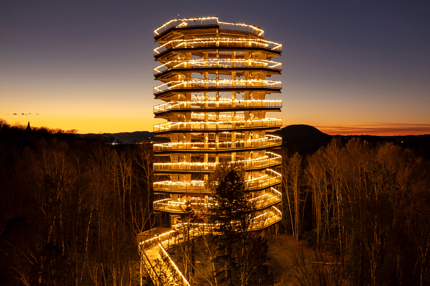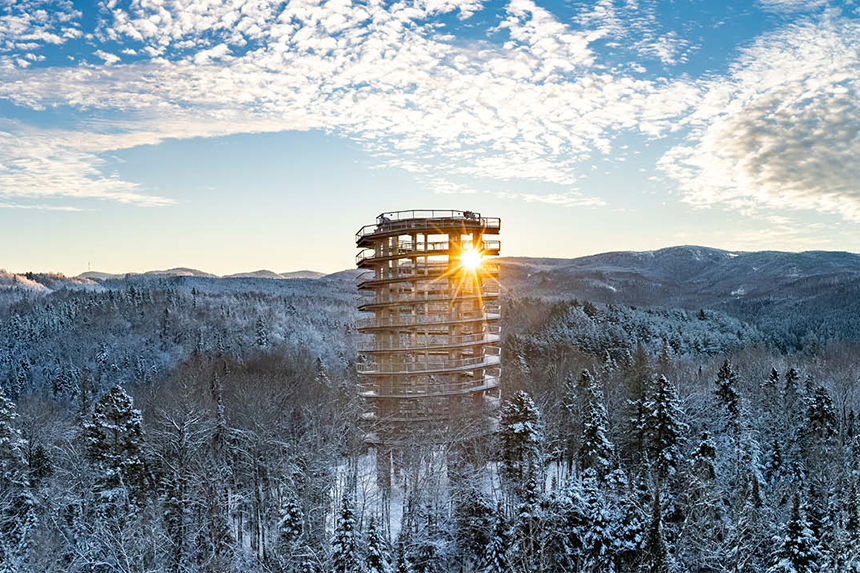 En journée, la balade offre une marche paisible en hauteur, jusqu’à une tour panoramique de 40 m qui domine les Laurentides.