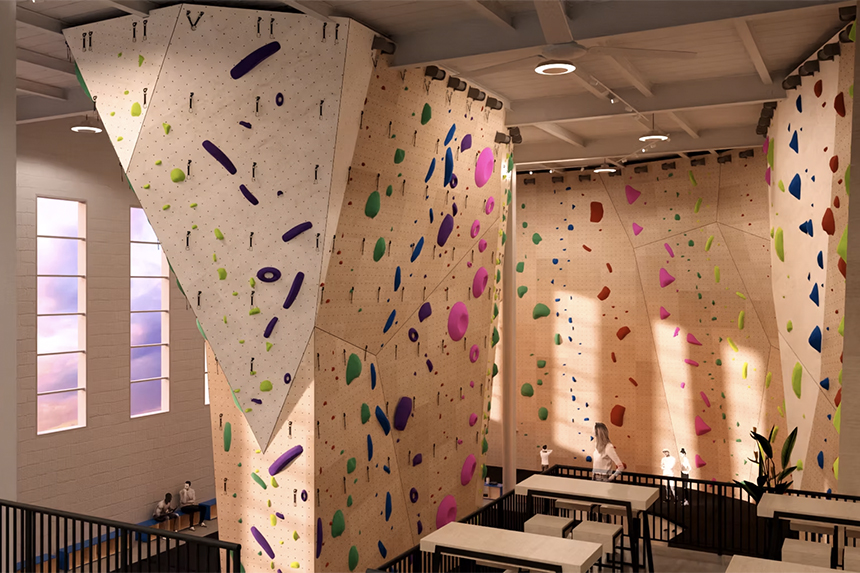 En plus des surfaces de grimpe, la salle comprend un café, renforçant l’aspect social et communautaire du lieu.