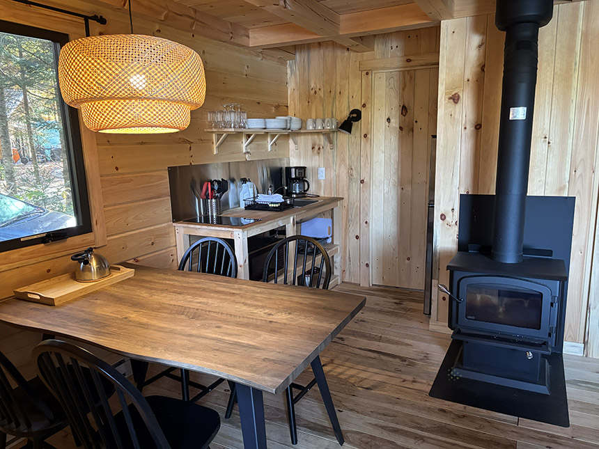 C’est justement dans l’un d’eux que nous avons posé notre sac à dos cet automne. Odeur de bois neuf, cuisinette bien équipée, poêle à bois, foyer extérieur, chambres fermées, mezzanine et salle de bain nous y attendaient. Notre unité se trouvait au bord de l’eau, avec un accès privé à l’un des deux lacs. Siroter un café sur le quai en regardant le soleil se lever a été l’un de nos plus grands petits bonheurs.