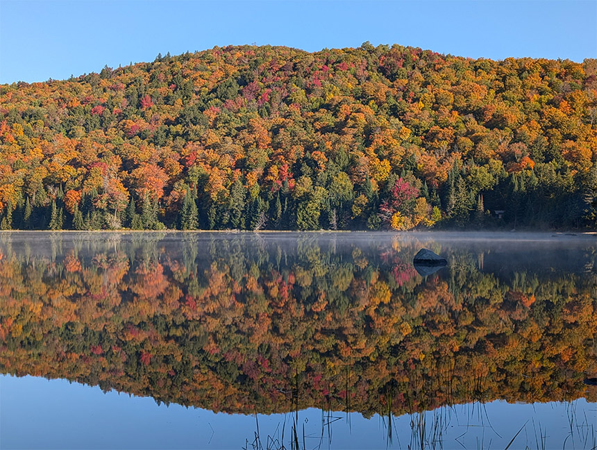 Il n’y a pas de meilleurs matins d’automne que ceux qui commencent par un chalet de bois, un lac couvert de brume et une forêt multicolore. C’est ce que l’on s’est dit, il y a quelques jours, en se réveillant au cœur du nouveau camping Huttopia de Mont-Blanc, dans les Laurentides.