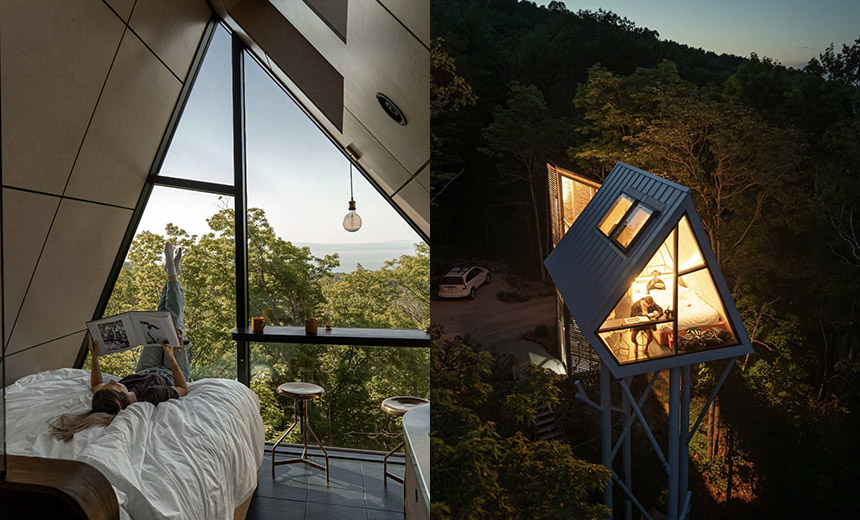 Un seul type de mini-chalet offert chez Repère Boréal peut être considéré comme une maison dans les arbres mais il s’agit d’un hébergement absolument hors du commun : le UHU. Perchée à 10 mètres du sol, cette habitation hyper design peut accueillir deux personnes en tout confort (salle de bain complète, cuisine, lit queen) et elle offre une vue sur la forêt, jusqu’au fleuve Saint-Laurent.