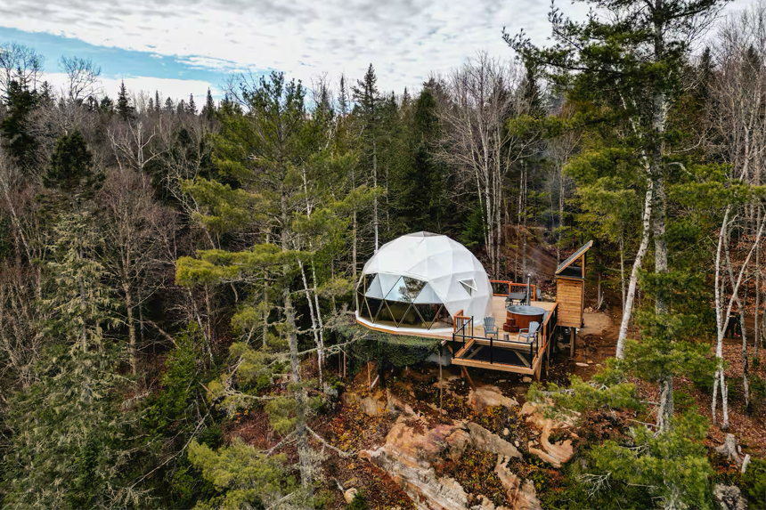 Les dômes semblent proliférer, au Québec. Des simples, des doubles et même des triples, comme chez Bel Air Tremblant, un domaine de chalets et mini-chalets haut de gamme. Chaque unité comprend une terrasse avec un sauna et un bain à remous privé avec vue sur les étoiles. À l’intérieur, le triple dôme est composé de trois dômes assemblés et tous reliés par une porte. Le confort est au rendez-vous. Les deux dômes situés aux extrémités forment les chambres avec, dans chacune, un lit king, une demi-salle de bain et une télévision, en plus de l’internet Wi-Fi. Les triples dômes peuvent donc accueillir quatre personnes, une famille ou deux couples.